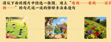 示例:在公园里,有的小朋友在跳绳,有的在打羽毛球,还有的在跑步。