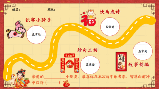 3.评价方式:采用《马年乐考季,智慧向前冲》闯关式评价,每完成一个关卡(关卡立牌详见展板设计),该老师根据完成情况写下学生福袋获得数,完成所有关卡即完成评价。