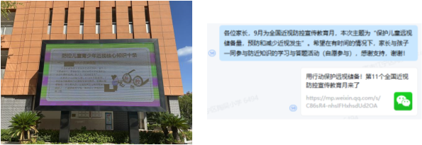 同时,我校也进行了充分宣传,利用电子大屏滚动播放近视预防科普知识,在宣传栏张贴爱眼护眼、近视防控知识海报,倡导学生和家长共同学习近视防控相关知识,积极参与防近知识网络答题活动,营造浓厚的爱眼护眼氛围,时刻提醒学生们自觉纠正不良用眼习惯。